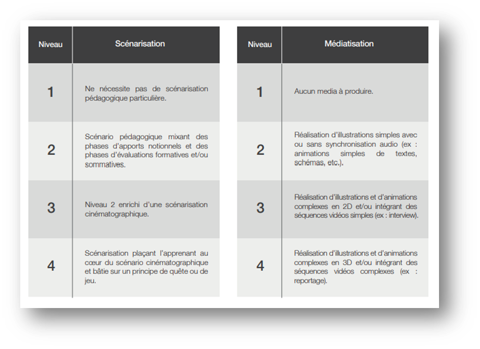 Cependant, le e-learning peut également présenter des défis, notamment en ce qui concerne la motivation et l'engagement des apprenants, la qualité de l'interaction avec les instructeurs et les pairs, ainsi que l'accessibilité pour tous les apprenants, indépendamment de leurs compétences technologiques ou de leurs handicaps. Pour répondre à cette demande d’accessibilité, il est recommandé de respecter dans son module e-learning la norme RGAA (Référentiel Général d'Accessibilité pour les Administrations). Elle vise à garantir l'accessibilité des services en ligne, y compris les plateformes et contenus d'apprentissage à distance, aux personnes en situation de handicap. Comme le e-learning repose largement sur des ressources et des interactions en ligne, il est essentiel que ces contenus et plateformes soient accessibles à tous, indépendamment des capacités physiques ou cognitives des utilisateurs. Ainsi, en conformité avec le RGAA, les plateformes de e-learning doivent être conçues et développées en tenant compte des directives d'accessibilité, telles que celles établies par les WCAG (Web Content Accessibility Guidelines) du W3C (World Wide Web Consortium). Cela implique de veiller à ce que les contenus multimédias soient sous-titrés ou accompagnés de descriptions textuelles pour les personnes malvoyantes, que les interfaces soient utilisables avec des technologies d'assistance pour les personnes ayant des limitations motrices, et que la navigation soit intuitive et facile à comprendre pour tous les utilisateurs. Autre défi : motiver ses apprenants et les surprendre quel que soit le niveau de scénarisation et de médiatisation choisis. La classification e-learning e2c permet de définir le niveau de réalisation d’un contenu e-learning en combinant deux indicateurs. Le premier correspond à la complexité du scénario pédagogique et le second au degré de médiatisation. Afin de répondre aux exigences du RGAA, la scénarisation et médiatisation seront parfois contraints.